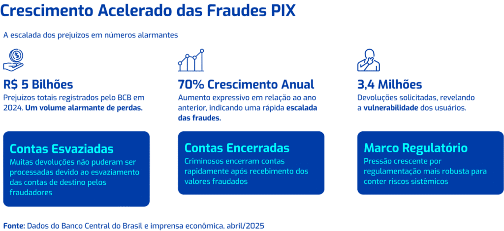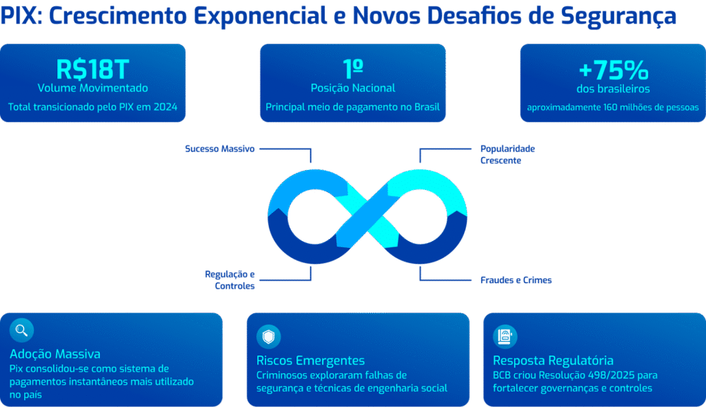 O crescimento acelerado do uso de novas tecnologias e riscos emergentes, como fraudes no sistema do Pix cresceram aproximadamente 70% no ano de 2024, destacando a importância da necessidade regulamentações e controles de segurança da informação cada vez mais robustos para elevar a segurança.